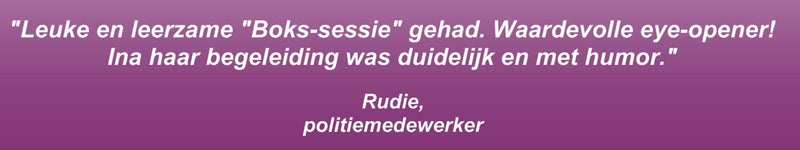 Er wordt weinig gepraat en veel gedaan. We gebruiken daarbij bokshandschoenen en een stootkussen. Ik begeleid je met een groot aantal oefeningen om te ervaren waar je jezelf tegenkomt en waar je dat herkent in je dagelijks leven. Daar gaan we vervolgens mee werken op een intensieve, maar ontspannen manier.